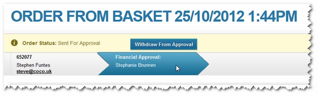 Note: It's possible for buyers to stop the process at this stage by clicking the Withdraw From Approval button. The system will send an email to the approver - telling them there is an order form waiting for them. See how they can approve an order form for more details.